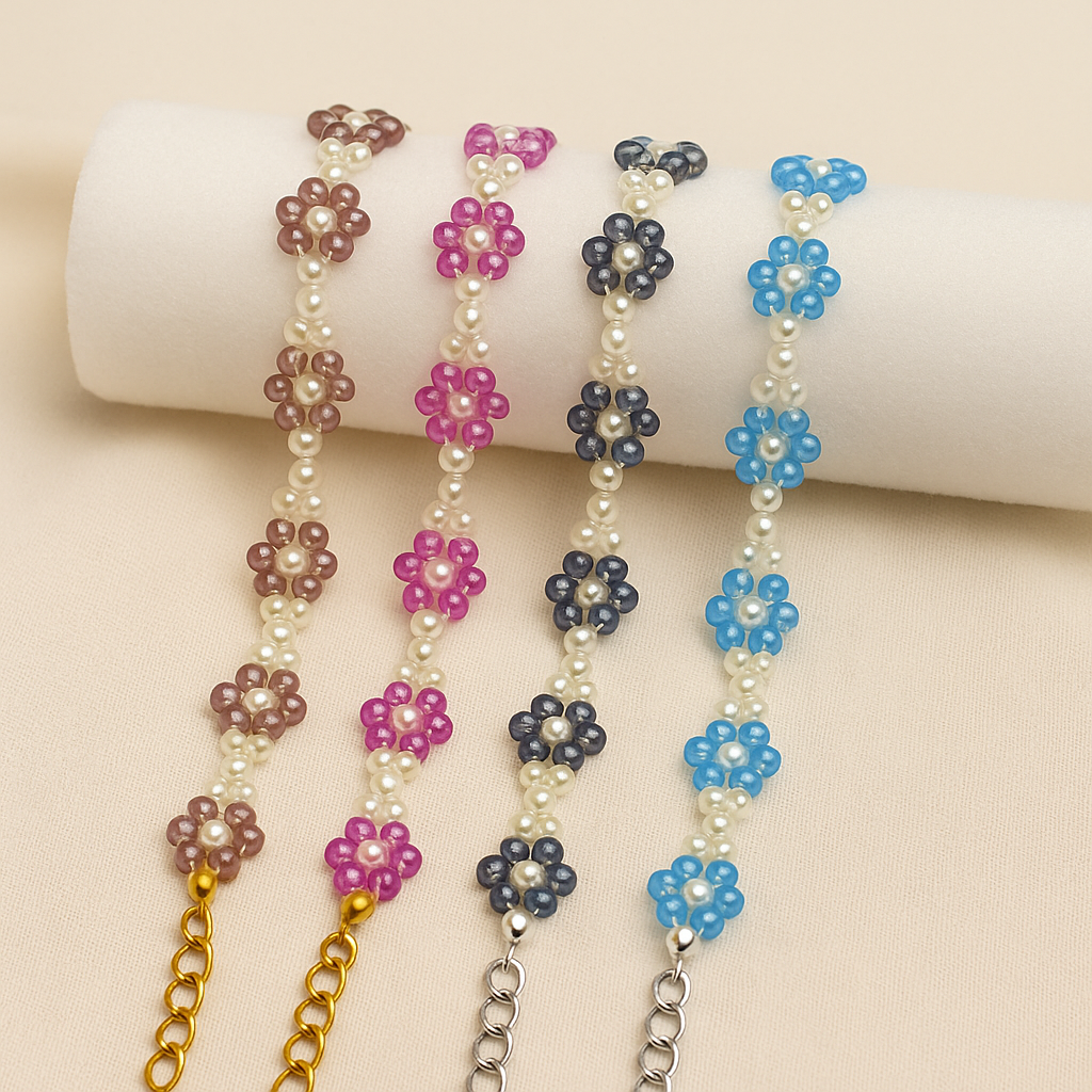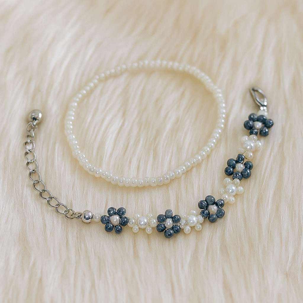 A harmony of dusk and light the Evergrey Bracelet blends the calm of moonlit tones with the purity of soft pearls. Handcrafted with smoky grey floral beads and luminous white pearls it embodies quiet strength, grace and timeless style. Its subtle shimmer adds a serene sophistication that complements every moment from everyday wear to special occasions.