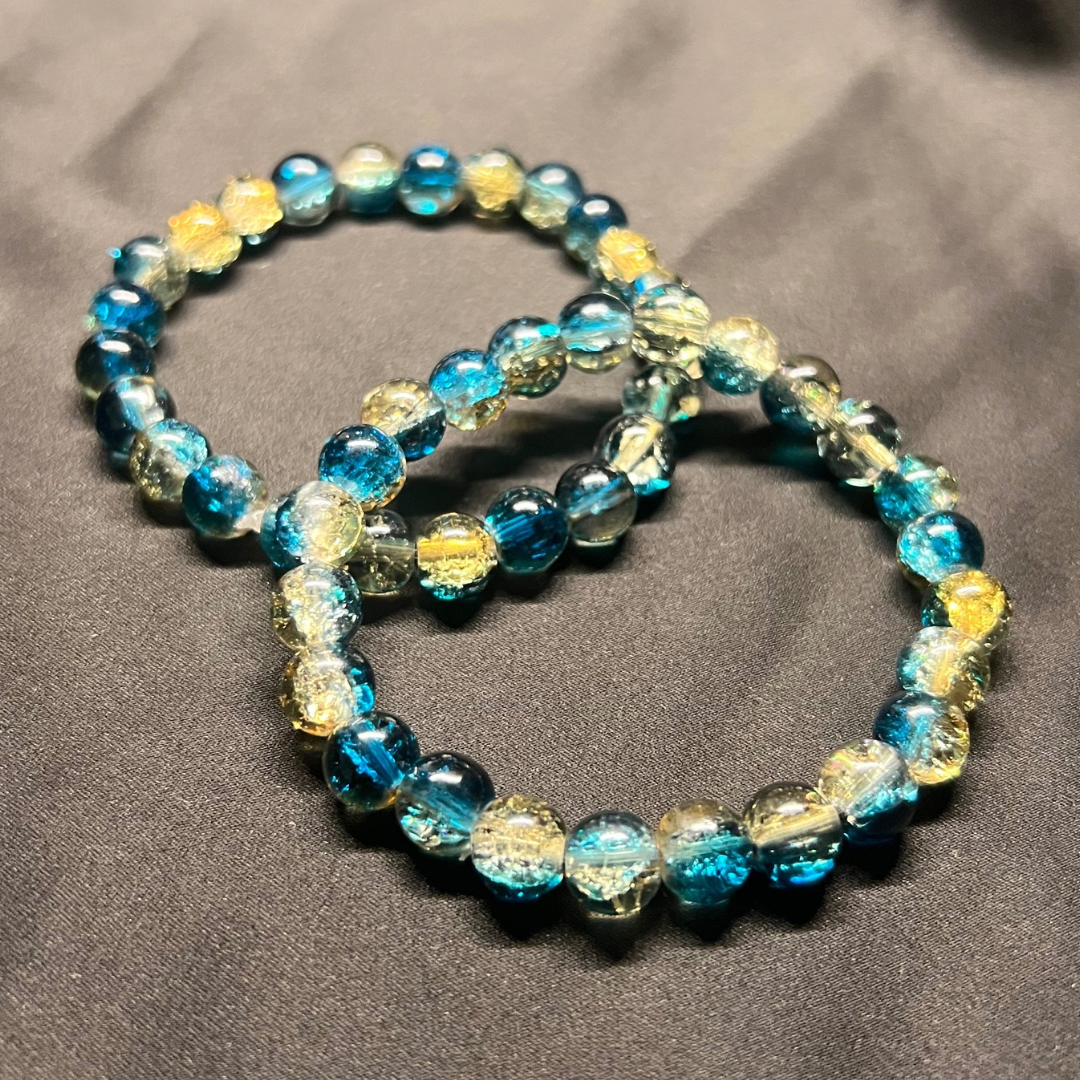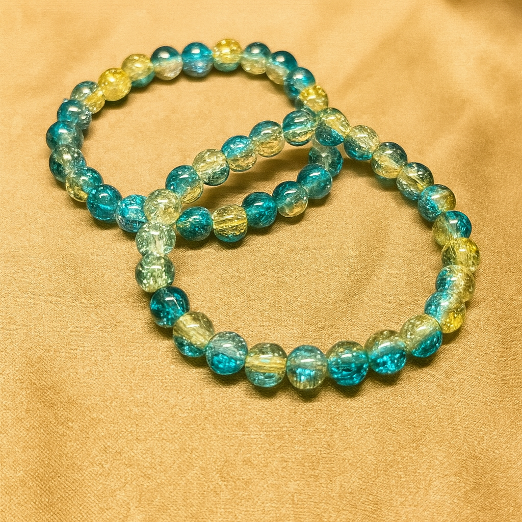 Dive into elegance with the Jaded Bracelet a bold design that blends calm and intensity. Featuring a vibrant mix of teal blue and golden yellow crackle beads it captures the shifting tides of emotion balancing serenity with fiery spirit. Its elastic fit ensures comfort and flexibility whether stacked with other pieces or worn solo as a statement of individuality.