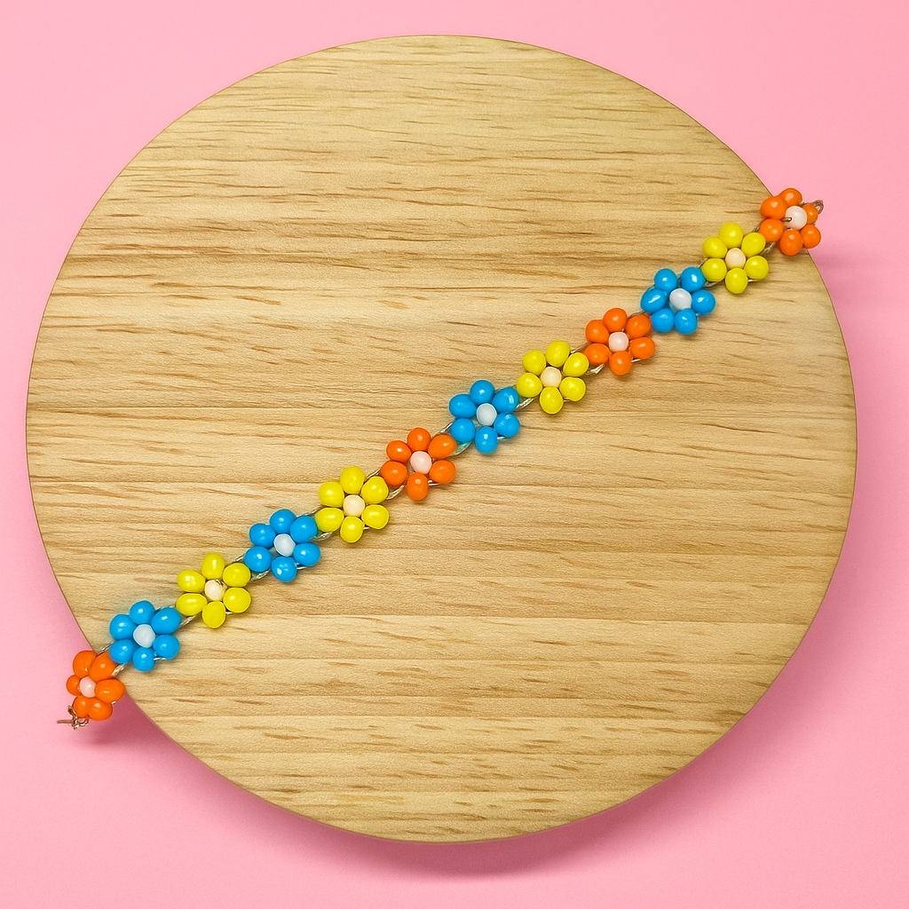 Bright, bold and full of cheer the Marigold Dream Bracelet brings a splash of sunshine to your style. Featuring dainty floral bead clusters in vibrant orange, sky blue and sunny yellow this playful piece captures the carefree spirit of summer days. Lightweight and secure with a classic clasp it’s designed for comfort while making a colourful statement.