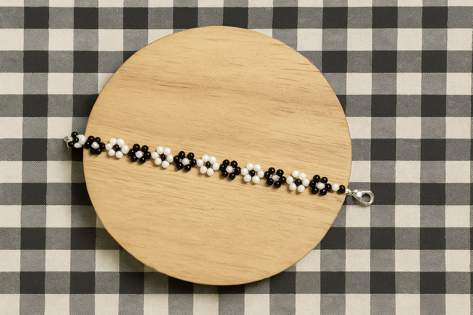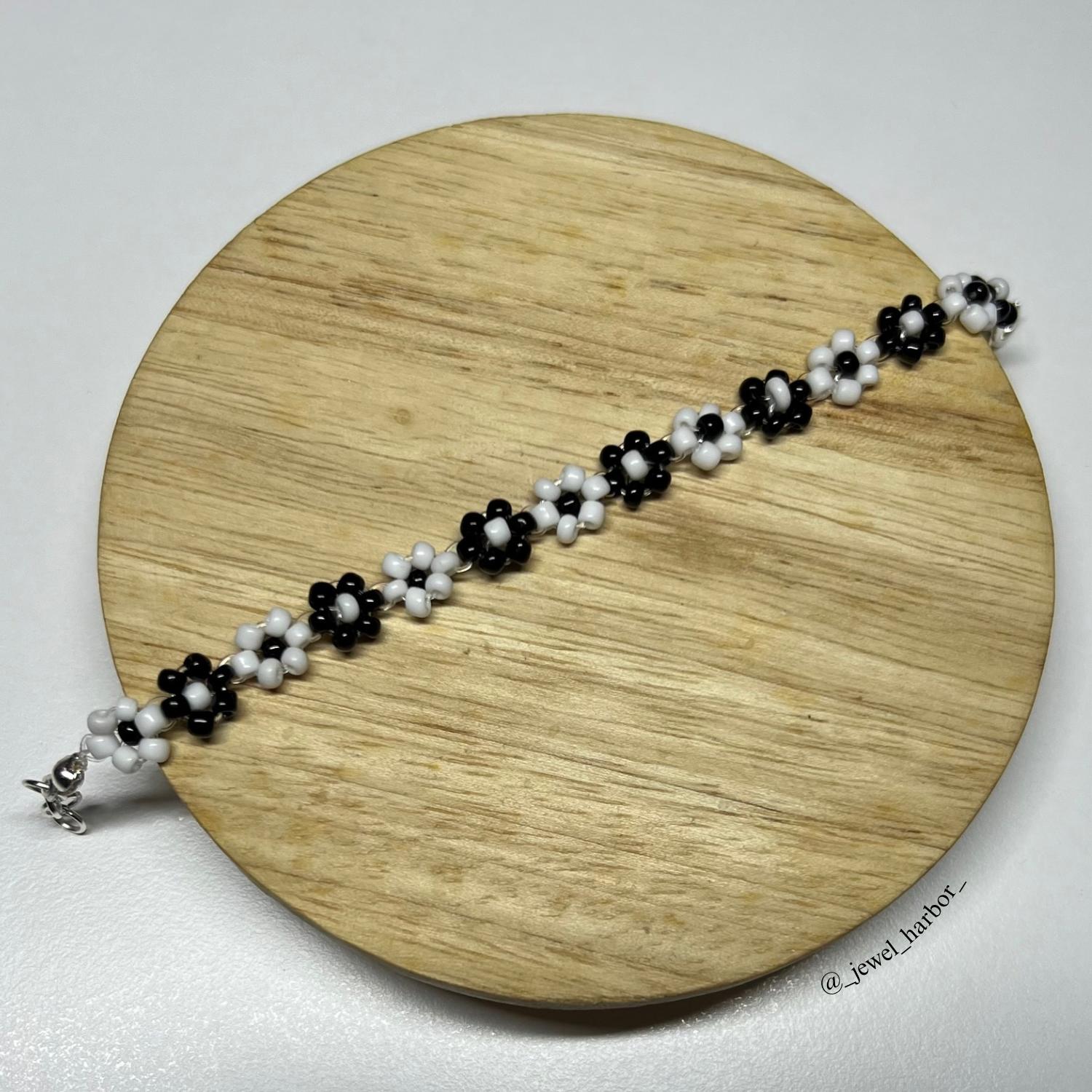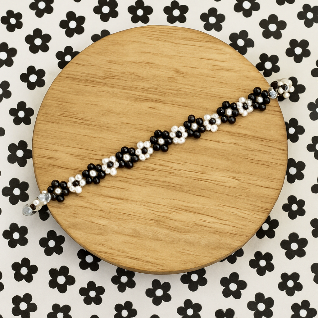 Classic black and white never goes out of style. The Midnight Daisy Bracelet blends timeless charm with bold contrast featuring dainty daisy shaped beads that bring a touch of elegance to any look. Lightweight and handmade with care.