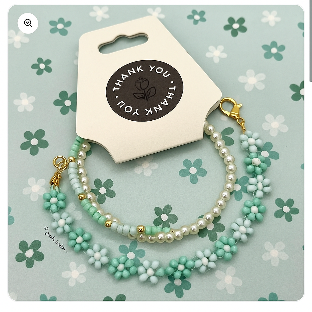Fresh, floral, and effortlessly elegant the Mint Magnolia Bracelet brings a calming touch of nature’s beauty to your style. Handcrafted with soft mint and pastel blue floral beads, paired with pearly whites and subtle golden details, this piece captures the breezy charm of spring.