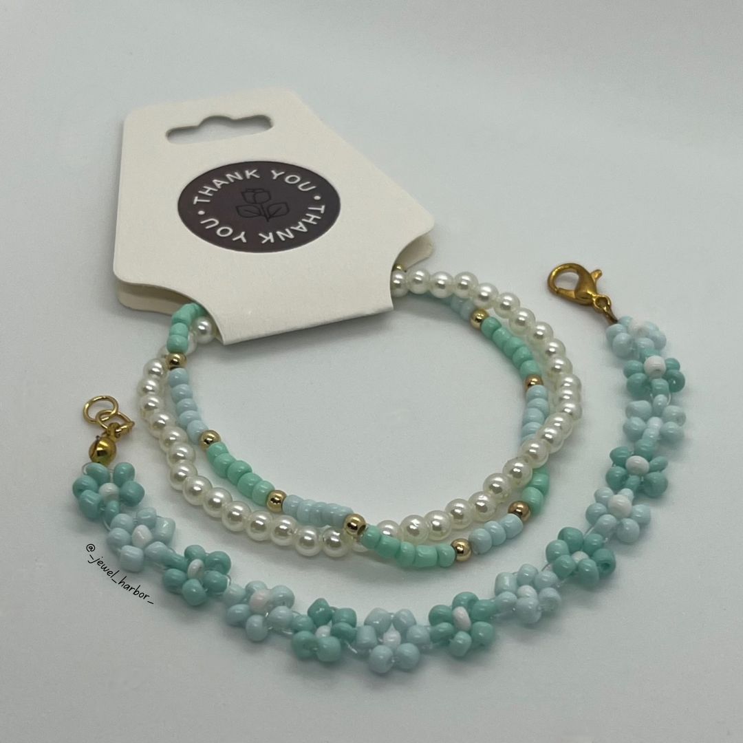 Mint & pastel blue floral beads for a serene, nature-inspired look