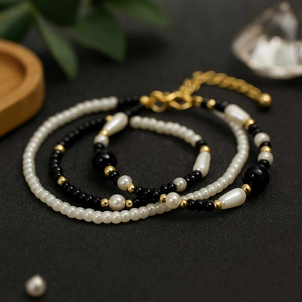 Part of the Ophelia Collection the Ophelia Black bracelet symbolises balance, sophistication, and quiet power. Black represents resilience and depth white pearls embody purity and timeless beauty and gold reflects prosperity and light. Together they tell a story of elegance rooted in strength a modern classic that speaks without words.