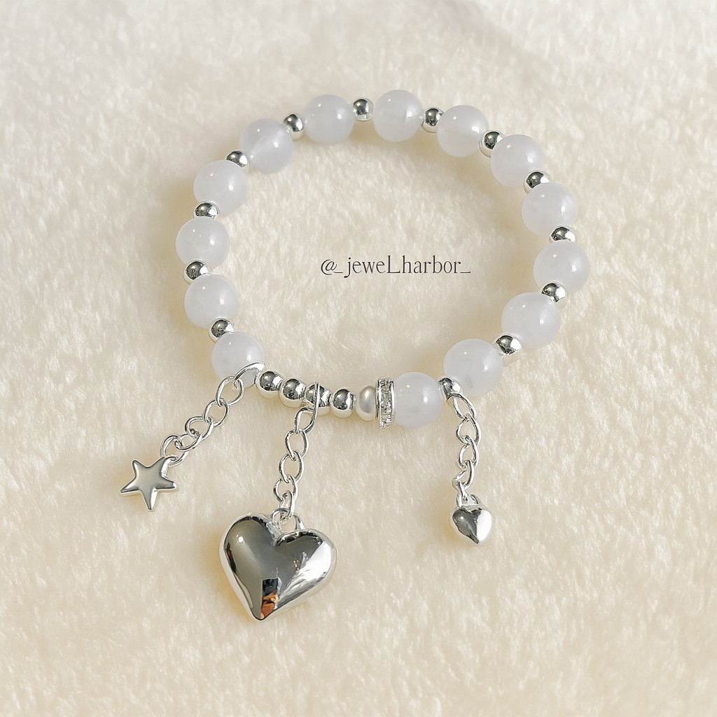 Step into the Garden of Athena, where wisdom meets wonder under the starlit sky. The Seren Bracelet captures this divine harmony with delicate frosted beads that glow like moonlight over olive leaves, accented with polished silver details. Dangling star and heart charms sway gently, echoing the goddess’s blessings of guidance and love.